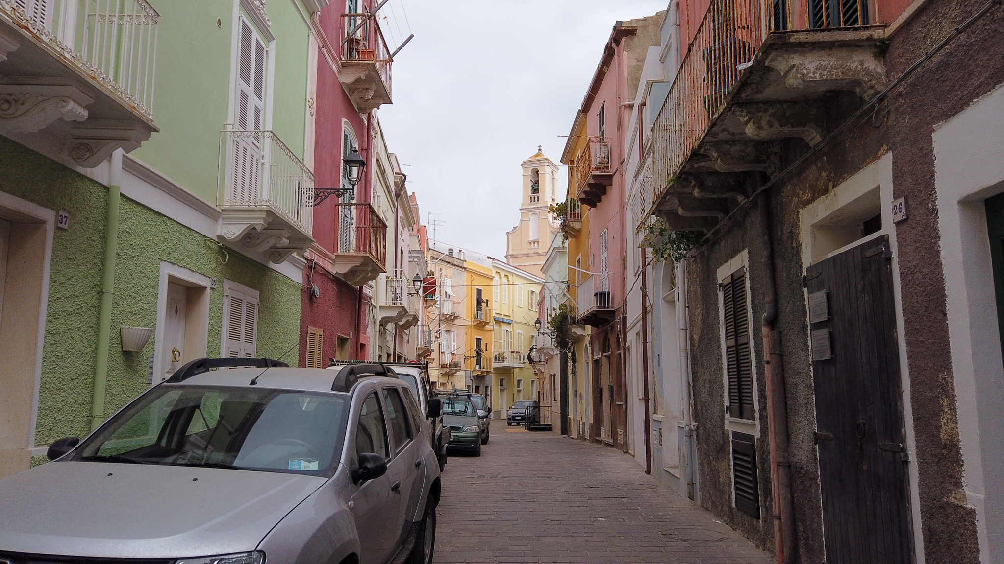 Ich hatte es bereits erwähnt: Es gibt auf San Pietro nur zwei befestigte Straßen. Das musste ich am zweiten Tag allerdings erst lernen. Denn beim Blick auf die Karte sehen die Verbindungen quer durch die kleine Insel eigentlich ganz brauchbar aus und ich will noch ein paar landschaftliche Highlights im Süden von San Pietro mitnehmen, statt auf direktem Weg zurück nach Carloforte zu radeln. Die ersten Kilometer ab der Abzweigung von der Hauptstraße sind vielversprechend betoniert, die auf dem Wegweiser angegebene Richtung: Paradiso. Doch als ich die größere Ferienhausansammlung hinter mir lasse, beginnt der Offroad-Spaß: Erst kann ich noch auf einer Sandpiste radeln und muss nur gelegentlich größeren Steinen ausweichen. Doch schon bald ist an Fahren nicht mehr zu denken und ich manövriere mein vollbeladenes Rad mühsam Meter um Meter durch Wasserrinnen von gerne einem halben Meter Tiefe, über scharfkantige, kindskopfgroße Steine und durch kratzige Macchia. Rings um mich: Nichts und niemand – also doch irgendwie paradiesisch. Als ich endlich und sogar pannenfrei eine asphaltierte Straße erreiche, bin ich aber doch erleichtert. Der Küstenabschnitt Mezzaluna und der kleine freistehende Fels „Le Colonne“, die in keinem Werbeprospekt über die Insel fehlen dürfen, sind dann aber doch noch ganz nett, wenn auch nicht wahnsinnig spektakulär (was vielleicht auch am immer wieder einsetzenden leichten Nieselregen liegt). In Carloforte irre ich dann noch ein bisschen durch die schmucken Gässchen und besuche die Piazza Repubblica – unter den uralten Bäumen trifft sich abends wohl der ganze Ort und verwandelt den Platz in ein großes wohliges Wohnzimmer.