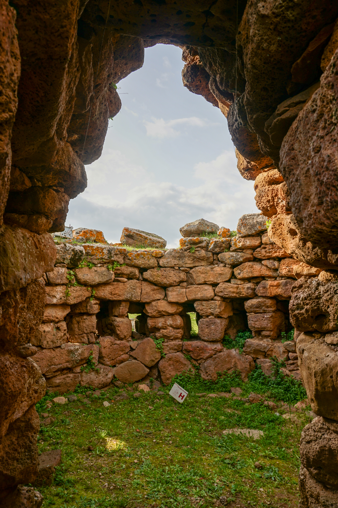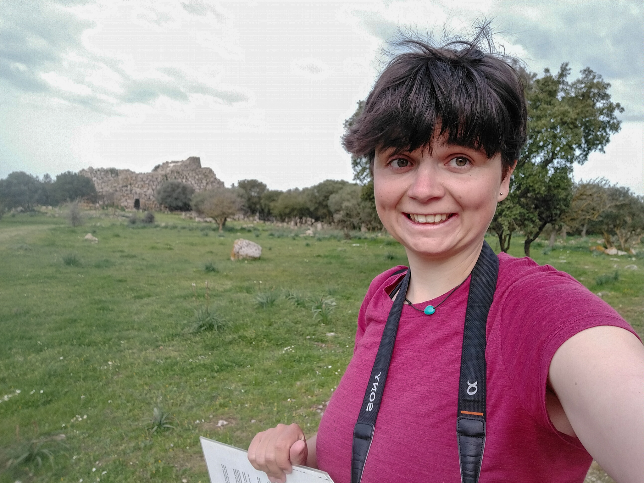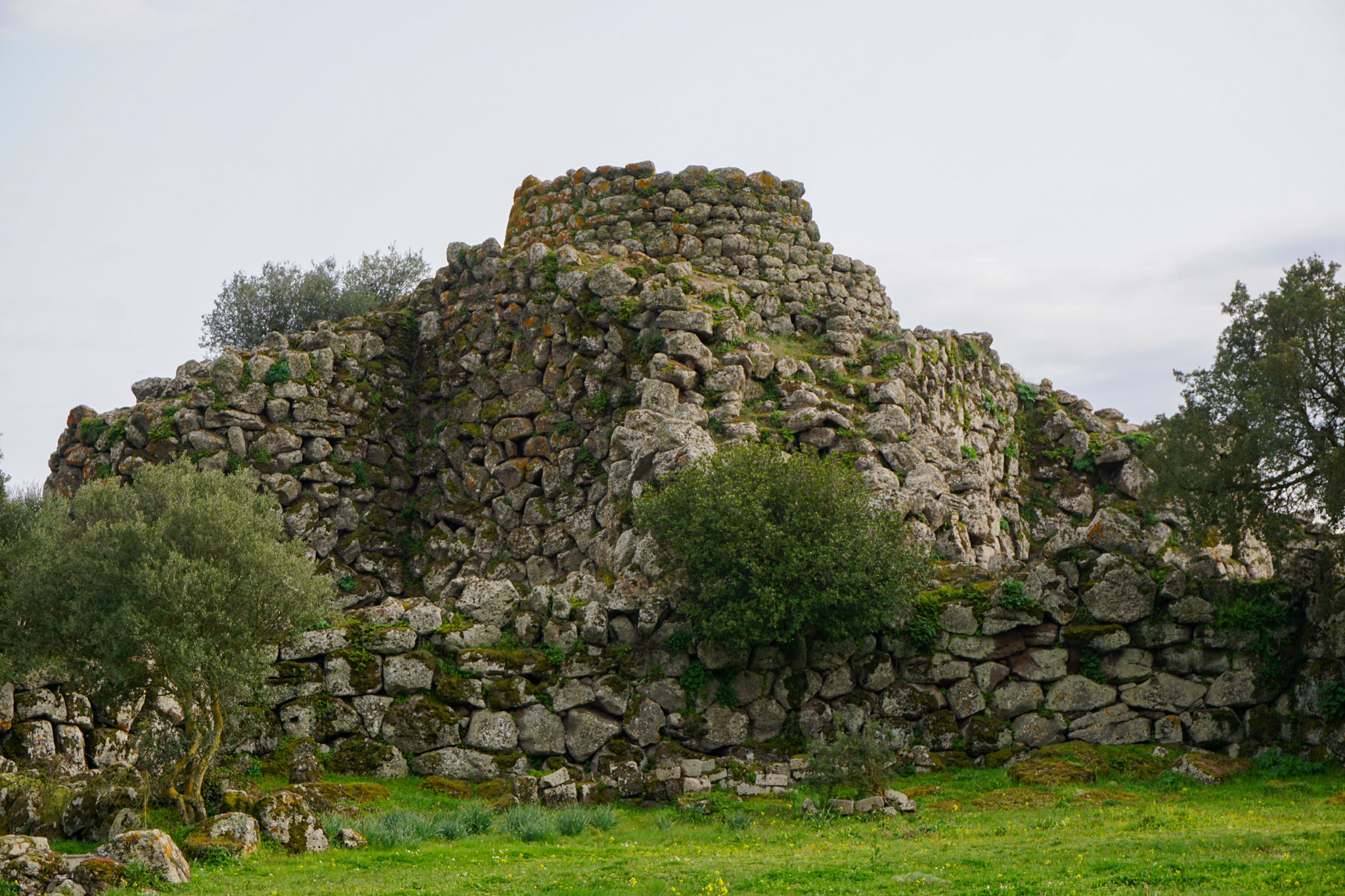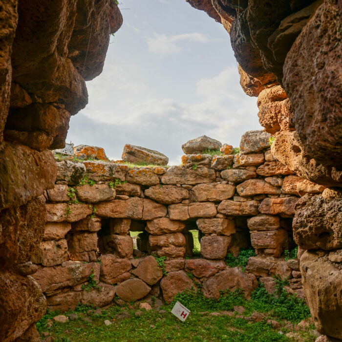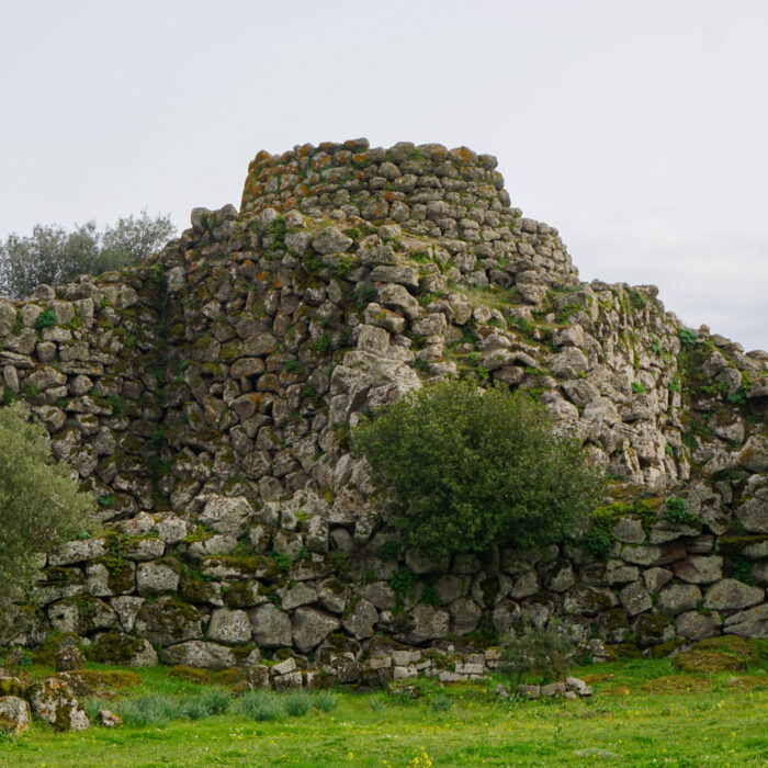 Keine Touristen bedeutet auch: Ich kann als weit und breit einziger Gast eine der am besten erhaltenen Nuraghen der Insel besuchen. Nuraghen sind etwas speziell sardisches: Die prähistorischen Bauwerke gibt es über die ganze Insel verteilt, sie stammen aus der Zeit von etwa 2200 bis 400 vor Christus. Wozu genau sie dienten – zum Beispiel als religiöse Stätten, zum dauerhaften Wohnen oder nur als Rückzugsort bei kriegerischen Auseinandersetzungen – darüber ist sich die Forschung uneins, da es keinerlei schriftliche Zeugnisse gibt. Funde aus der Nuraghenkultur gibt es in großer baulicher Vielfalt, von einzelnen, wenig erhaltenen Gebäuden bis hin zu komplexen, noch heute gut sichtbaren festungsähnlichen Anlagen und Siedlungen. Ich besuche die „Nuraghe Arrubiu“, die auf der offiziellen Tourismus-Seite Sardiniens als „eines der bedeutendsten vorgeschichtlichen Denkmäler des gesamten Westens, die imposanteste Megalith-Anlage der Insel, seltenes Beispiel einer erhaltenen Fünfeckbastion“ beworben wird. Der Name „Arrubiu“ bedeutet soviel wie „der Rote“ und ist auf die Flechten zurückzuführen, die die Steine bedecken und ihnen eine rötliche Farbe geben. Arrubiu wurde etwa 1500 v.Ch. errichtet und ca. 900 v.Ch. nach einem Teileinsturz verlassen. Danach wurde sie mehrmals wieder genutzt, unter anderem von den Römern, von denen man hier zwei Anlagen zum Weinkeltern fand. Die Anlage besteht aus fünf großen Türmen im Inneren, der größte davon war einst dreistöckig und rund 30 Meter hoch, heute misst er nur noch die Hälfte. Sie sind von einem Hof umgeben, an den weitere kleinere Türme in einer Art Verteidigungsring anschließen. All das besteht aus massiven Steinblöcken. Die Kunstfertigkeit, mit der die Menschen von damals es schafften, daraus Kuppeln und mehrstöckige Gebäude zu errichten, ist beeindruckend. Auf den Informationstafeln wird beschrieben, wie die Freilegung funktionierte und was dabei alles gefunden wurde – soweit ich das richtig verstanden habe, konnte man aus den verbrannten Brotkrumen sogar schlussfolgern, wie und mit welchen Zutaten gebacken wurde. Insgesamt also ein sehr lehrreicher und spannender Ausflug und zudem auch sehr hübsch anzusehen inmitten der blühenden Wiesen.