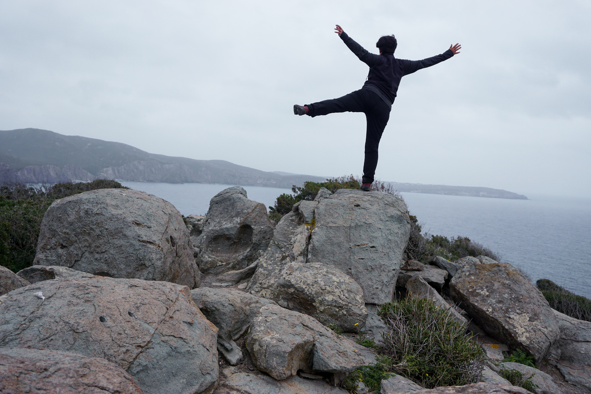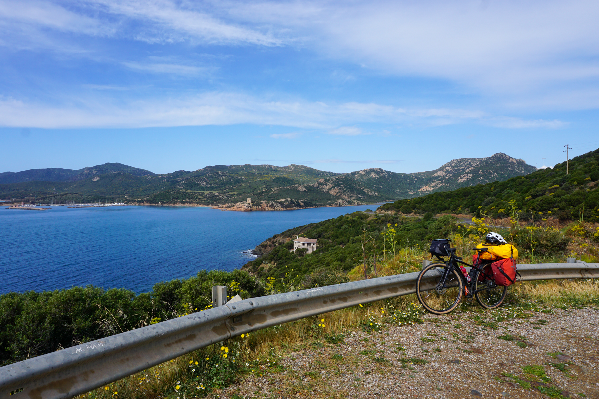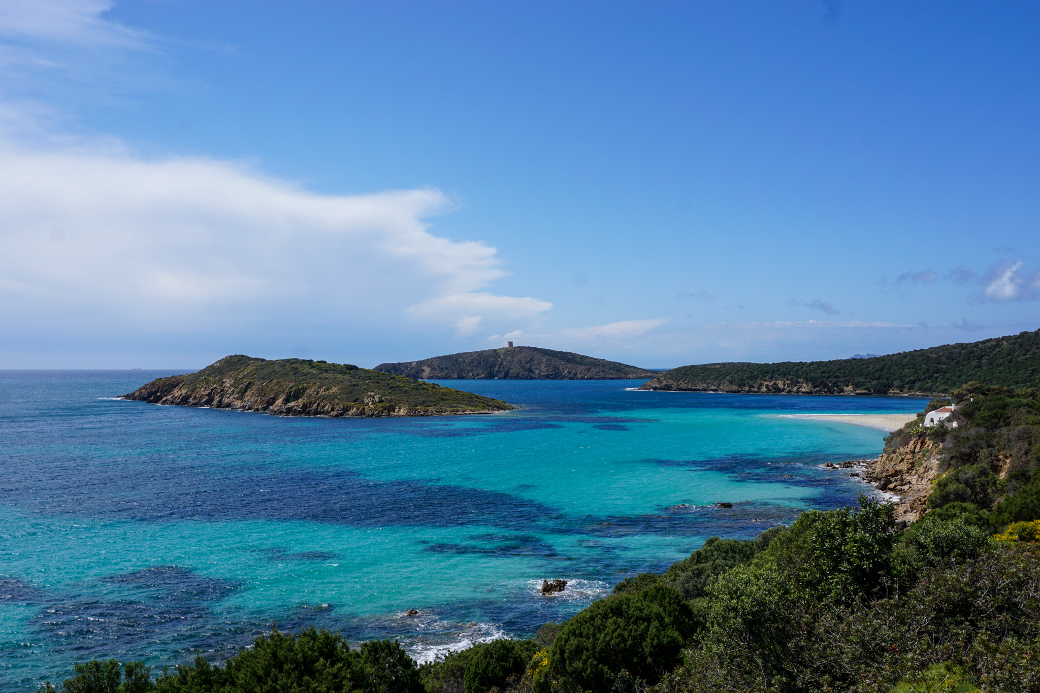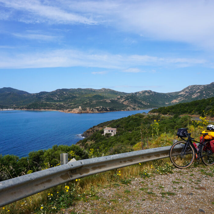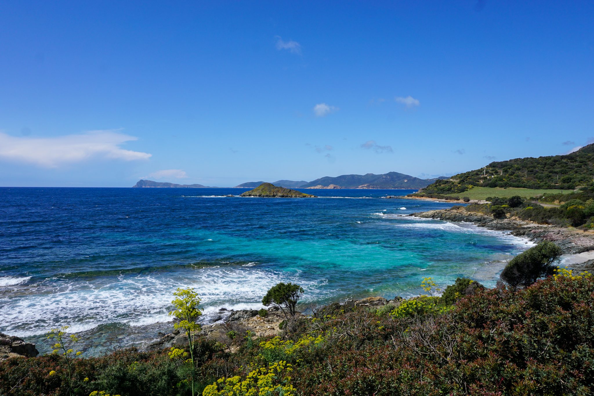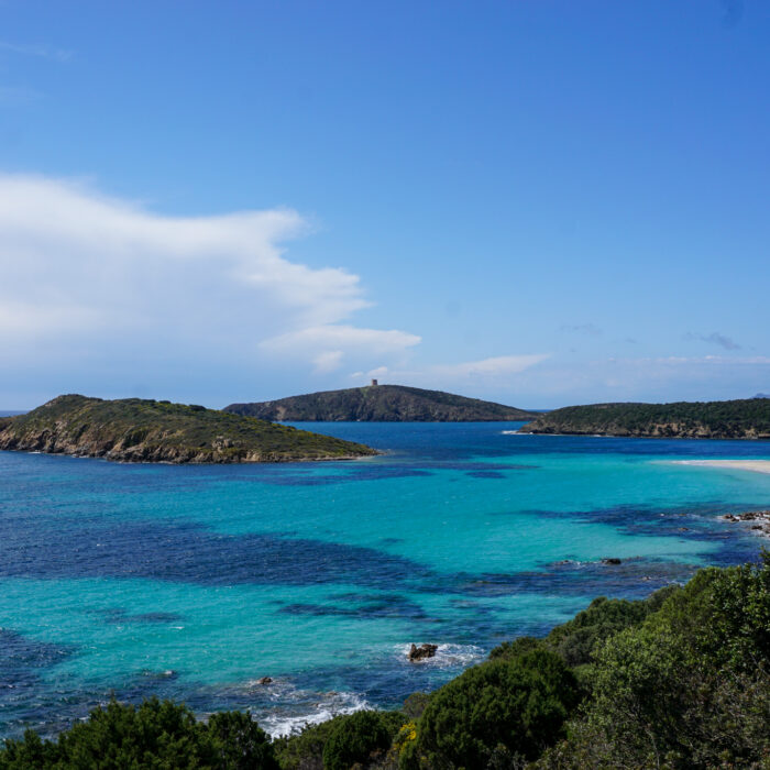 Letztes Highlight auf Sardinien: Die Küstenstraße SP71, die sich in vielen Kurven ganz im Süden teils hoch über türkisblauem Wasser ihren Weg durch wunderschöne Landschaft windet. Ich entdecke sie mal wieder zufällig bei der Planung des nächsten Tages, finde bei der Recherche aber auch auf Listen von Dingen, die man auf der Insel unbedingt machen sollte, ganz oben. Der Tag startet zwar aprilmäßig durchwachsen, bringt dann aber doch noch unerwartet viele Sonnenstunden und damit fantastisch in allen Blautönen schimmerndes Wasser. Am Straßenrand wächst wilder grüner Spargel, von dem ich zwar schon gehört habe, der aber sonst recht schwierig zu finden war. Obwohl der Straßenverlauf einige Höhenmeter mit sich bringt, versuche ich (quasi dauergrinsend) beim Fahren jeden Moment in mich aufzusaugen und denke mir: So fühlt sich Glück an.