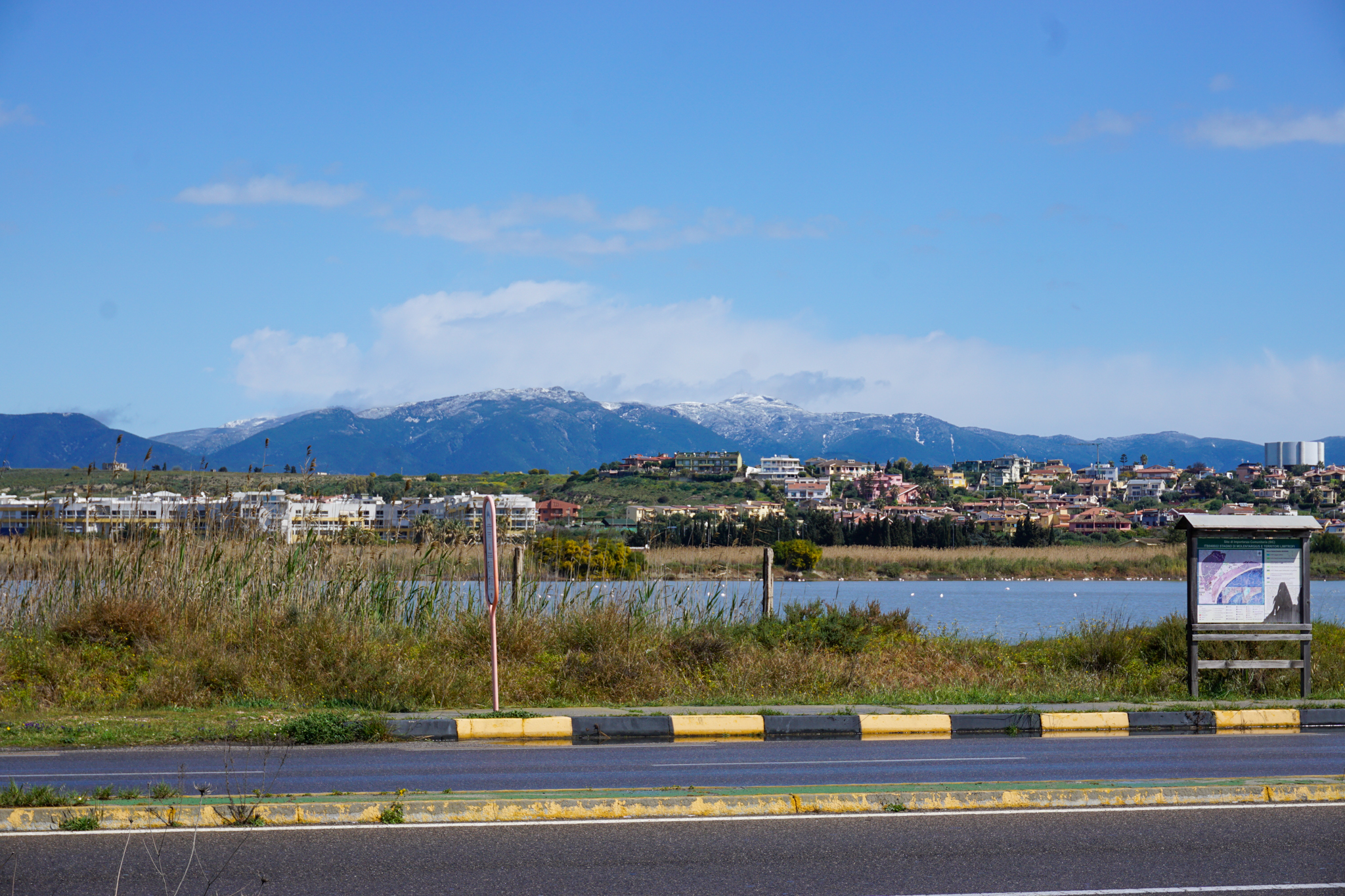Die letzten Kilometer in die Hauptstadt Cagliari verlangen mir nochmal einiges ab: Mein alter Bekannter Gegenwind zeigt sich mal wieder in voller Stärke, dazu kommen gelegentliche Regenschauer, bei denen ich im riesigen Industriegebiet leider nie rechtzeitig einen schützenden Unterstand finde. Trotz Fahrt auf dem Randstreifen der zweispurigen Schnellstraße kann ich immerhin der Landschaft unmittelbar vor Cagliari noch einiges abgewinnen und die Flamingos in der Nähe beobachten – einmal fliegt sogar einer direkt über mir. Schließlich nächtige ich aber nicht in Cagliari, sondern lasse die große Stadt schnell hinter mir, um in Quartu Sant’Elena bei Luca, Silvia und ihren Eltern eine sehr schöne Zeit mit vielen anregenden Gesprächen zu verbringen. Außerdem bin ich in dieser Nacht besonders froh um den warmen Schlafplatz, denn als wir am nächsten Morgen aus dem Fenster blicken, kann man auf den Gipfeln in der Ferne Schnee sehen. Bekannte der Familie, die nicht weit entfernt von Ulassai wohnen, wo ich noch vor Kurzem war, haben Bilder mit von Schnee bedeckten Artischockenfeldern gesendet… Viel Zeit, um die touristischen Attraktionen Cagliaris abzuklappern bleibt dann nicht, denn: Die Fähre nach Palermo, Sizilien wartet.