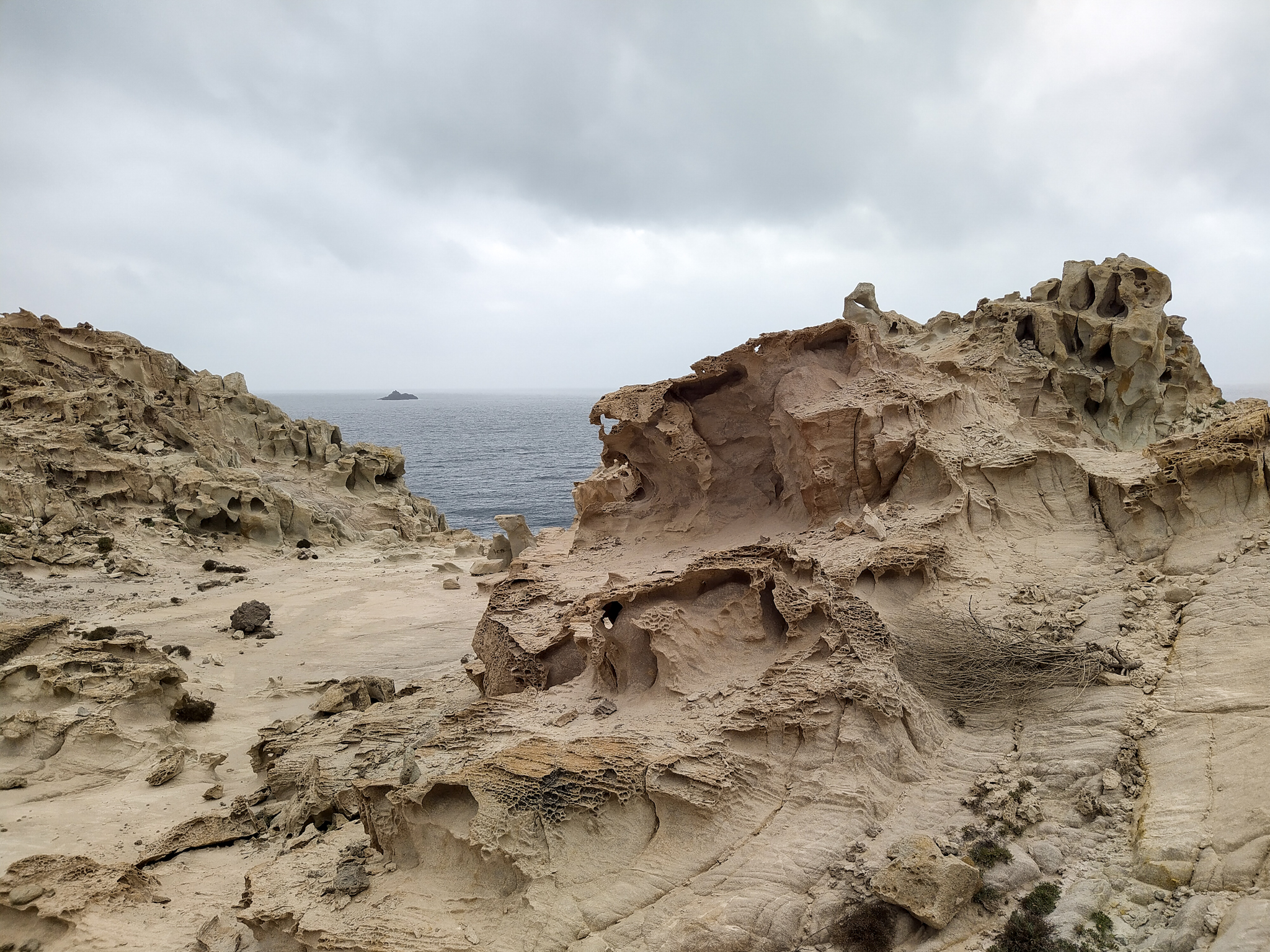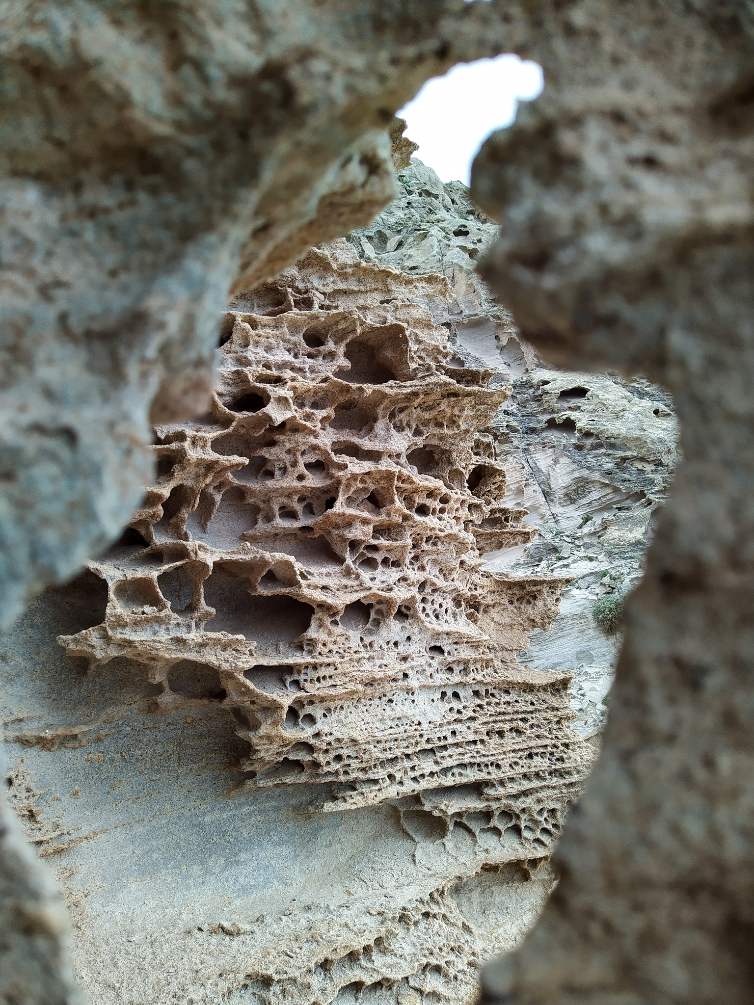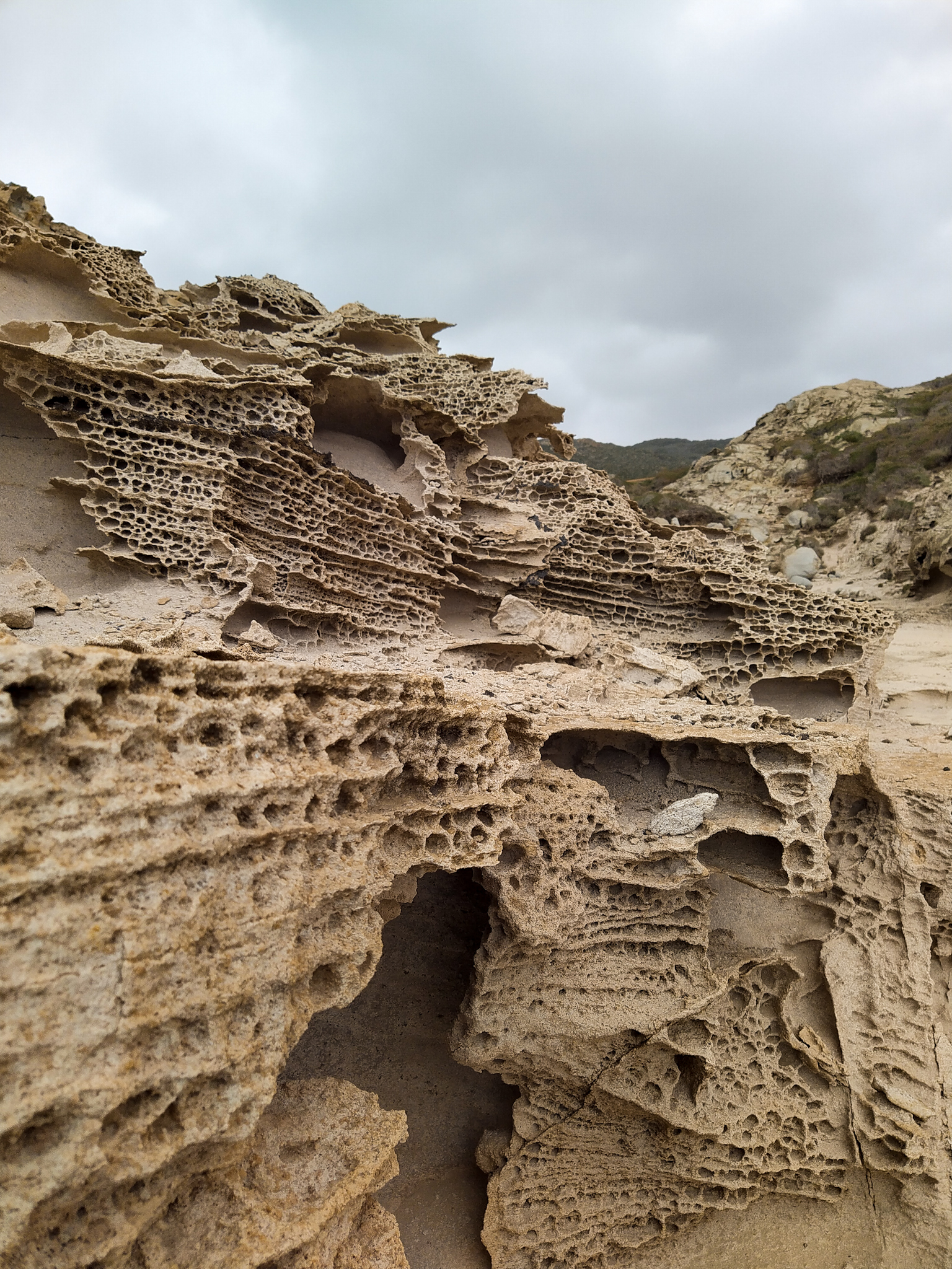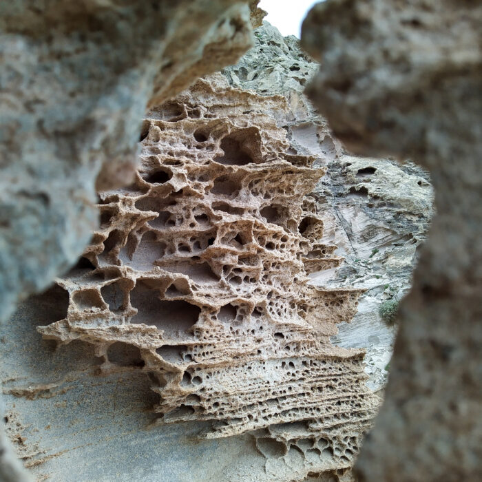 Eigentlich auf der Suche nach einem geeigneten Platz, um mein Zelt in diesem Niemandsland aufzustellen, finde ich noch weitere wirklich spektakuläre Felsformationen: In einer Art Wabenstruktur ist der Sandstein zu tausenden kleinen Höhlen und Löchern ausgefräst. Alles wirkt so kleinteilig und delikat, als könnte es jeden Moment zerbrechen und ist trotzdem sehr massiv. Hier könnte ich stundenlang fotografieren – aber leider ist es nicht mehr ewig hell und ich brauche einen Schlafplatz. Nach etlichem Suchen finde ich schließlich aber noch eine perfekt ebene Kuhle, gut geschützt vor neugierigen Blicken.